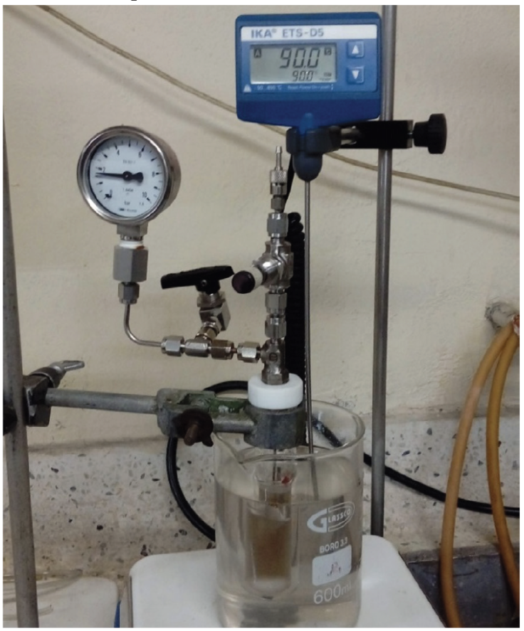 Las pruebas catalíticas se realizaron en una autoclave de vidrio (Figura 4), en diferentes atmósferas: Reductora: H2; Oxidante: O2; Inerte: N2. Las reacciones se llevaron típicamente a 10 h, 90 ºC, 1 bar, 10 mL de Tolueno (Fisher Chemical, 99,9%) y 3,44 mmol de alcohol alilico (Merck, >99%) con 5,0 % en peso de catalizador.