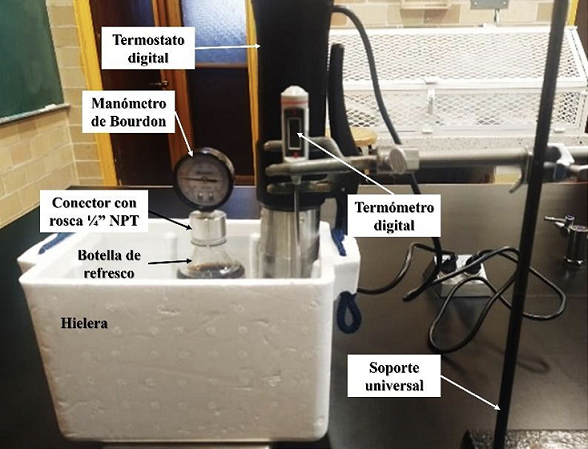 Figura 1 Sistema experimental para la determinación de la presión manométrica a varias temperaturas en una botella de refresco.