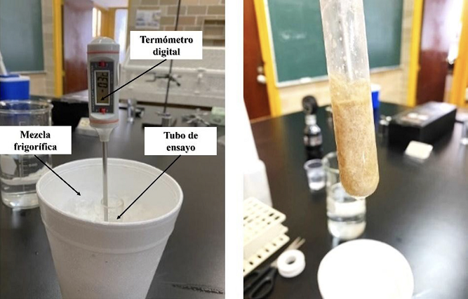 Por último, determinar la temperatura de congelación, tanto del agua destilada como del refresco. Colocar aproximadamente 3 mL de cada uno de ellos en dos tubos de ensayo respectivamente, y sumergirlos en una mezcla frigorífica de sal de grano y hielo en escarcha, colocada previamente en el vaso de unicel de 500 mL, midiendo la temperatura en intervalos de 5 s, hasta que esta sea constante durante 30 s (véase la Figura 2).