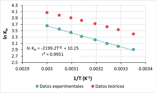 Los valores experimentales de ΔH 0 y ΔS 0 fueron comparados con los informados en la literatura, empleando la referencia (Kuntzleman y Sturgis, 2020), obteniendo errores del 0.4% para ΔH 0 y 5.1% para ΔS 0, lo que indica que la metodología experimental a pesar de ser sencilla permite obtener resultados satisfactorios. Asimismo, se compararon los valores de ln KH experimentales con respecto a los teóricos en el intervalo de temperatura de trabajo antes mencionado, como se muestra en la gráfica de la Figura 3, obteniéndose errores experimentales de no más del 15%.