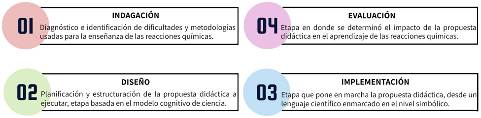 El desarrollo de nuestra investigación tuvo lugar gracias al cumplimiento de cuatro etapas, por tanto la metodología y análisis de los resultados se discutirán en torno a ellas: en la primera etapa “indagación” mostramos el análisis de la población de estudio, problema educativo abordado y relacionamos que tipo de metodologías usan las instituciones educativas para la enseñanza y el aprendizaje de las reacciones químicas. En la etapa de “diseño” presentamos como se estructuró la propuesta didáctica a partir del modelo cognitivo de ciencia, en la tercera etapa “implementación” resumimos paso a paso la metodología llevada a cabo para poner en marcha la propuesta. Finalmente presentamos la etapa de “evaluación” del impacto de la propuesta didáctica en el aprendizaje de las reacciones químicas desde un lenguaje científico enmarcado en el nivel simbólico.