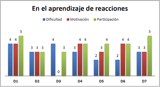 Como se observa (Figura 2), el grado de dificultad que presentan los estudiantes para el aprendizaje de las reacciones químicas, fue valorado entre 3-4, en una escala donde 5 es el nivel máximo. Según estos indicadores se infiere que existe cierta dificultad para que ellos comprendan reacciones químicas. También se confirma cuando mencionan la posibilidad de alcanzar mejores resultados si tuvieran más actividad con sus estudiantes en el laboratorio o mejorar su aprendizaje a partir de relacionar mejor los contenidos de los procesos químicos con situaciones de la vida cotidiana (Muñoz, Blanco y Franco, 2015).