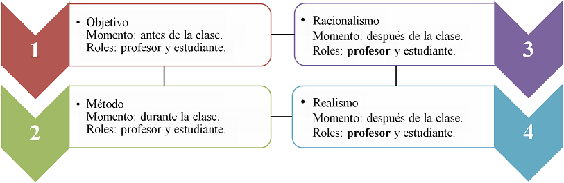La actividad base de esta propuesta didáctica fue el aprendizaje de la simbología de las reacciones químicas, donde se utiliza el nivel simbólico en la representación tanto de las ecuaciones como reacciones químicas. Al ser un lenguaje científico, no habitual en la vida de los estudiantes, requiere de un proceso de planeación y acercamiento, la clave está en el diseño de estrategias de aprendizaje que los acerquen mucho más a su comprensión. El desarrollo de la experiencia educativa en el aula de clases tuvo en cuenta el modelo cognitivo de ciencia, se basó en teorías del aprendizaje específicas sustentadas en los referentes teóricos citados (Giere, razonamiento científico de cómo se construye el conocimiento en ciencias, especialmente el concepto de modelo utilizado para la interpretación del mundo real) e (Izquierdo, modelo cognitivo de ciencia aplicado a la ciencia escolar). Se propuso poner en práctica las cuatro dimensiones que lo describen: objetivo, método, racionalismo y realismo (Figura 3) y a partir de la participación activa, tanto del docente como de los estudiantes en cada etapa, recolectar datos que demuestren como se pueden evidenciar estos cuatro componentes en el aprendizaje.