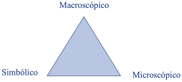 Desde la perspectiva de Johnstone (1993), son tres los niveles que se entrelazan para mejorar la comprensión de las ciencias naturales: el nivel macroscópico correspondiente a las percepciones sensoriales, el nivel microscópico a través del cual se explica de manera iónica, atómica y molecular, lo que se percibe en el nivel macroscópico y el nivel simbólico hace referencia a los modelos, ecuaciones y fórmulas que se utilizan para representar los otros dos niveles. Estos se representan de manera conjunta en un triángulo, donde cada esquina corresponde a uno de estos niveles (Santos & Arroio, 2016), como se representa en la Figura 1.