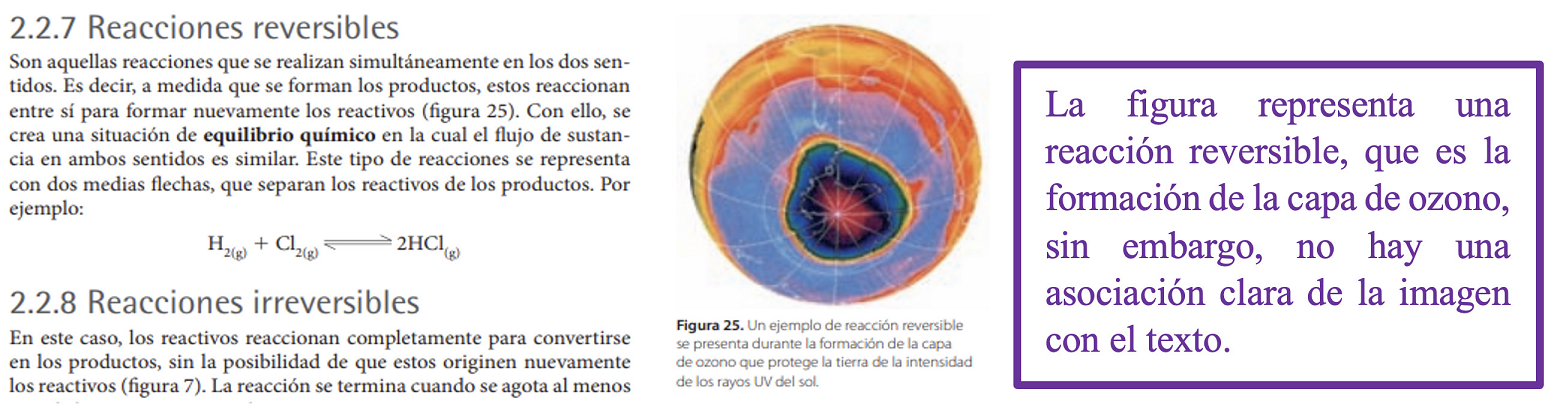 En relación con el lenguaje gráfico y el lenguaje escrito, los textos, de manera general, establecen muy pocas relaciones de especialización y cooperación, esto limita el potencial que tendrían las representaciones, especialmente las gráficas, para comunicar el concepto de reacción química más allá de una definición básica.