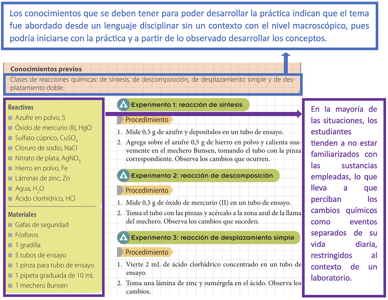 En los textos 1, 2 y 3 la característica del lenguaje que predomina es la disciplinar, dando la impresión de que el tema es tratado sin hacer una transición recurrente entre lo que es conocido por el estudiante y el fenómeno que se quiere representar. Por el contrario, los textos: 4, 5 y 6 se acercan al componente macroscópico desde un lenguaje con características cotidianas o muy cercanas a la cotidianidad, no obstante, las prácticas de laboratorio propuestas involucran condiciones del lenguaje disciplinar muy propias de los laboratorios químicos, a continuación, se ejemplifica esta situación en la Figura 3.