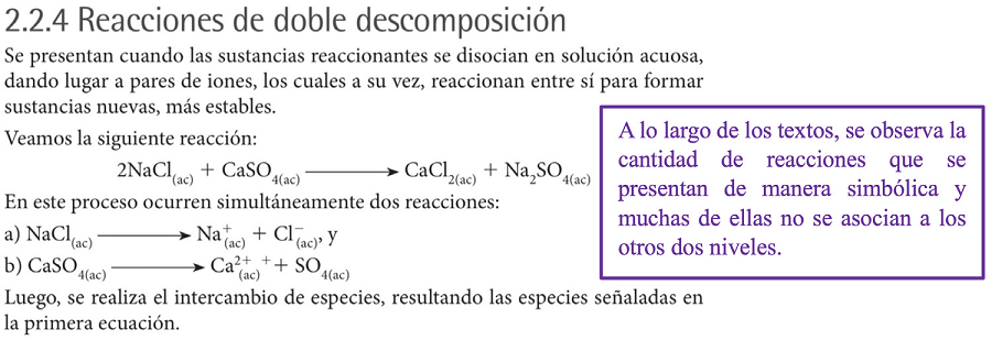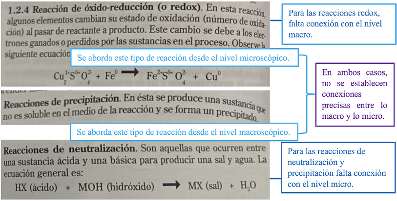 Consiste en priorizar un nivel de representación diferente para cada tipo de reacción química que se presenta en un mismo texto, sin articular este nivel con los otros dos, lo cual, imposibilita la comprensión completa de lo que se quiere comunicar. Este obstáculo se evidenció en tres de los textos analizados ya que presentan las reacciones de oxido reducción desde el nivel microscópico y luego se prioriza el nivel simbólico sin articular las representaciones anteriores con el nivel macroscópico, mientras que otro tipo de reacciones como las de precipitación o neutralización se abordan desde el componente macroscópico y luego se prioriza el nivel simbólico sin articular los conceptos con el nivel microscópico.