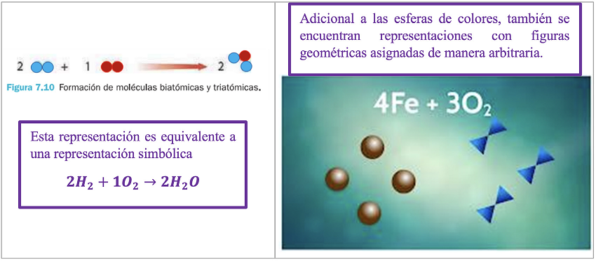 En los 6 textos analizados, el modelo de Dalton es el que representa la microscopia de las reacciones para el lenguaje gráfico, sin embargo, este modelo puede ser interpretado como una representación simbólica alternativa, puesto que los símbolos son letras asociadas a cada elemento y a partir de ellas se crea una fórmula química que refleja la cantidad correspondiente de átomos en una molécula. De manera análoga, se asignan colores a las esferas que representan los átomos y a partir de ellas se construyen las moléculas con la cantidad de esferas correspondientes. Este obstáculo se ejemplifica en las Figuras 7.