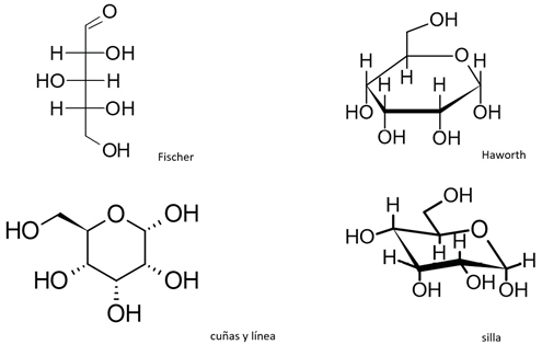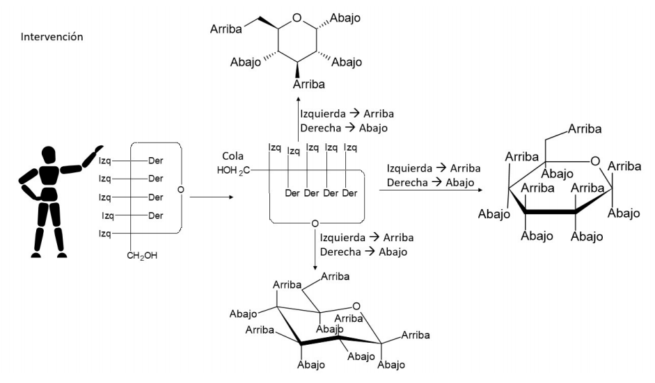 Grupo B: al grupo se les explica la interconversión entre la proyección de Fischer, la conformación de silla, las fórmulas de Haworth y de cuñas y líneas utilizando la Figura 2, siguiendo los pasos de la estrategia didáctica.