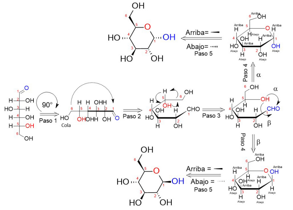 A continuación, se describe el paso a paso de la estrategia planteada para dibujar la formación de anómeros a partir de la proyección de Fischer asignando los estereocentros (Figura 3).