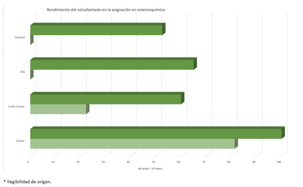 Como se muestra en la Figura 4, hubo un gran aumento en el rendimiento académico para asignar la configuración absoluta de estereocentros para las fórmulas de Haworth y silla, de 0% a 65% y de 0% a 52,5% respectivamente; para las fórmulas de cuñas y líneas el aumento fue de 22,2% a 60% y para las proyecciones de Fischer de 81,3% a 100% mostrando que la proyección de Fischer fue la representación más sencilla para la asignación de configuración absoluta de estereocentros. Los datos anteriores permiten visualizar que la estrategia didáctica que se presentó al estudiantado los ayudó para la asignación de la configuración absoluta de estereocentros de diversas moléculas orgánicas, pudiendo desarrollar habilidades visoespaciales para la interconversión de las diferentes representaciones.