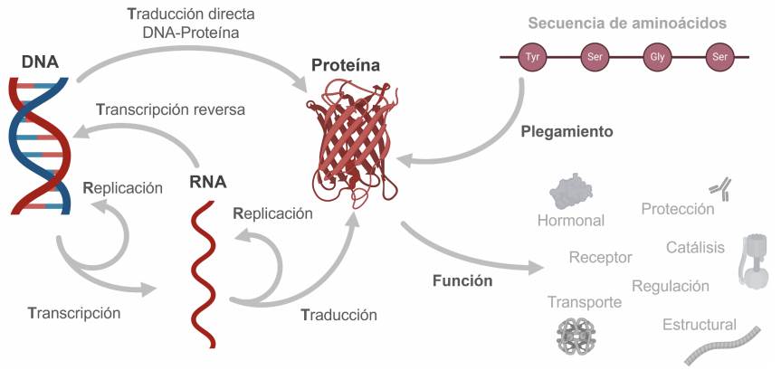 En las células, el ácido desoxirribonucleico (DNA) almacena información hereditaria que permite transmitir características a la descendencia y contiene, entre otros datos, las secuencias codificadas de aminoácidos necesarias para producir proteínas (Rodríguez-Sotres, 2005). Por su parte, las proteínas actúan como las máquinas celulares encargadas de organizar y copiar al DNA y al ácido ribonucleico (RNA), degradar nutrientes para producir energía, sintetizar azúcares, lípidos, aminoácidos y casi todos los componentes de las células, transportan componentes de un sitio a otro, permiten el movimiento, detectan estímulos de luz, sonido y contacto con vecinos amigables u hostiles, y cumplen muchas otras funciones vitales (Figura 1). Dicho de otro modo, sin proteínas, no habría vida en la Tierra.
