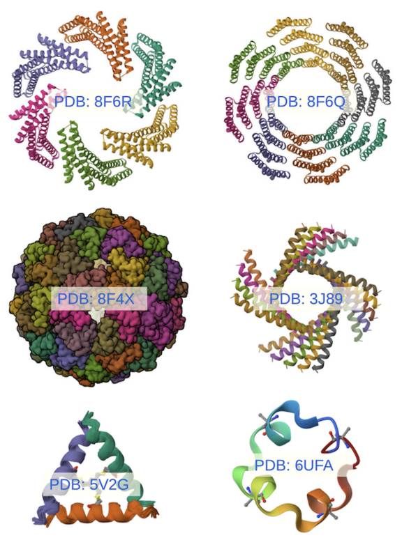 Figura 2 Esquema de la estructura de algunas proteínas artificiales diseñadas por el grupo de David Baker usando la herramienta Rosetta en sus diferentes versiones.