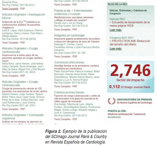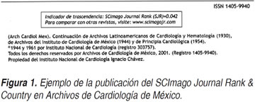 La necesidad de contar con un índice comparativo entre la calidad de las revistas hizo surgir en su momento al Impact Factor (generalmente referido en español como factor de impacto, el uso de la palabra en español, es por lo menos cuestionable en este contexto; además, nos referiremos a este índice por su denominación en inglés ya que trata de un nombre propio y registrado). Desafortunadamente sólo tres revistas de este grupo cuentan con Impact Factor , Revista Española de Cardiología, Arquivos Brasileiros de Cardiologia y Revista Portuguesa de Cardiología. Surge entonces la necesidad de contar con un índice alternativo para poder comparar nuestras revistas. Se propone que en cada revista se incorpore en su página Web su puntuación de SCImago Journal Rank & Country (SJR). Este indicador se basa en el algoritmo de Google Page Rank y está disponible para todas las revistas que figuren en Scopus (que son muchas más de las que figuran en el Citation Journal Reports de ISI-Thomson ). Este índice de trascendencia está disponible para un mayor número de revistas de nuestra red, incluyendo: la Revista Española de Cardiología, Archivos de Cardiología de México, Arquivos Brasileiros de Cardiologia , y Revista Argentina de Cardiología. Archivos de Cardiología de México y Revista Española de Cardiología ya han dado un paso en este sentido al incluir en su página de ''legales'' el índice de trascendencia correspondiente. El formato adoptado por Archivos de Cardiología de México incluye la descripción en el índice con una pequeña leyenda abajo que reza ''Para comparar con otras revistas, visite: www.scimagojr.com'' (Figura 1). En esta página se pueden obtener los índices de todas las revistas y el sitio web permite hacer comparaciones directas entre revistas en general, entre revistas de la especialidad e incluso entre revistas de un mismo país. En el caso de la Revista Española de Cardiología han optado por presentar su índice al lado del Impact Factor (Figura 2).