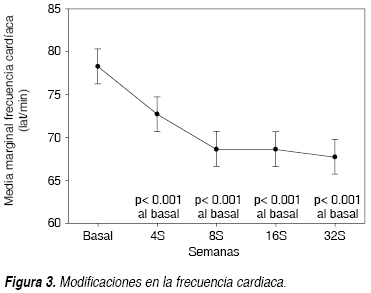 Las reducciones para la presión arterial sistólica fueron de 33.3 y 37.5 mmHg en posición sentado y de pie, respectivamente; y para la presión arterial diastólica de 18.4 mmHg y de 18.2 mmHg, respectivamente. Las tasas de respuesta para esta población fueron de 42.9% a las cuatro semanas y de 85.7% a las 32 semanas del inicio del tratamiento. En referencia a la frecuencia cardiaca, se observó una disminución promedio entre el inicio y las 32 semanas de tratamiento de 10.8 latidos/minuto (p < 0.001). Estos pacientes concluyeron el estudio con frecuencia cardiaca promedio de 67.05 latidos/minuto (IC 83.5-63.4) (Figura 3).