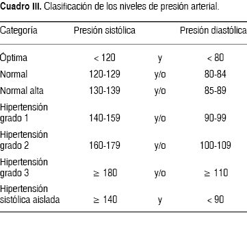 La presión arterial se midió en ambos brazos en la primera visita y la que resultara más elevada fue considerada en todas las visitas; se usaron esfigmomanómetros de mercurio y la Fase I y V de Korotkoff para determinar las presiones sistólica y diastólica respectivamente. Las determinaciones se hicieron cinco minutos después de que el paciente arribara al consultorio y otros cinco minutos adicionales entre los registros en posición sentado y de pie. Entonces se clasificó el grado de hipertensión de acuerdo con los Lineamientos para el manejo de la hipertensión arterial del ESH/ESC 2007 1 (Cuadro III).