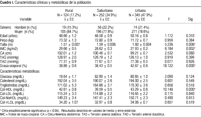 Las características metabólicas se muestran en el (Cuadro I). El valor significativo por ANOVA fue para el colesterol HDL en las poblaciones rurales en donde se encontró (42.61 ± 0.8), para la suburbana de (39.59 ± 0.5) y la urbana con (43.29 ± 0.6) (F = 10.148 gL = 2, sig .000) siendo desfavorable para el medio suburbano y por prueba t entre Ocolusen, Michoacán (39.3790) y La Purísima, Guanajuato (41.0152), desfavorable clínicamente para Michoacán aunque estadísticamente resultaron ser homogéneos.