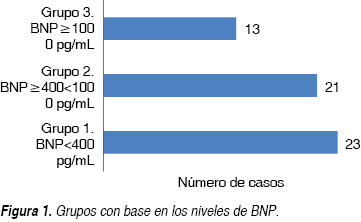 Durante el periodo comprendido entre julio de 2010 y julio de 2012, se seleccionaron 57 pacientes con diagnóstico de endocarditis infecciosa del Servicio de Cardiología, los cuales cumplieron con los criterios de inclusión. La distribución de los pacientes por grupos fue con base en los niveles basales de BNP (Figura 1).