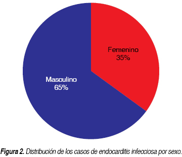 Al llevar a cabo el análisis de información, encontramos que la media de edad de los pacientes con endocarditis infecciosa en nuestra unidad fue de 44 años, contrario a lo reportado en la literatura donde actualmente los pacientes más afectados son aquéllos de edad mayor (70-80 años), como resultado de procedimientos relacionados con la asistencia sanitaria. Esto probablemente sea debido a que nuestro hospital es un centro de referencia de tercer nivel, donde el diagnóstico en un paciente mayor constituye un verdadero reto para el clínico, ya que la presentación clínica en estos pacientes puede ser atípica. Esto pudiera tener como consecuencia que en este grupo de edad la endocarditis infecciosa pudiera ser subdiagnosticada. El género más afectado fue el masculino con una relación 1.8:1, muy similar a lo reportado en la literatura.1 Las válvulas nativas izquierdas fueron las más afectadas, y al igual que lo reportado en la literatura, la válvula aórtica fue la más frecuentemente afectada con un 53%.1