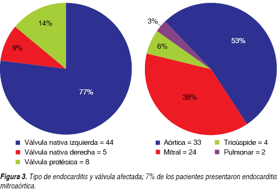 El tipo de endocarditis más frecuente fue el de válvulas nativas izquierdas, encontrándose en 44 de los casos (77.2%); de éstas, la válvula aórtica fue la más frecuentemente afectada con 33 casos, representando el 53% del total de los pacientes. La endocarditis asociada con válvula protésica se presentó en 14% de los pacientes de forma global. La distribución de pacientes por afección valvular de forma global se observa en la figura 3 y las características basales por grupos, se observan en el cuadro II.