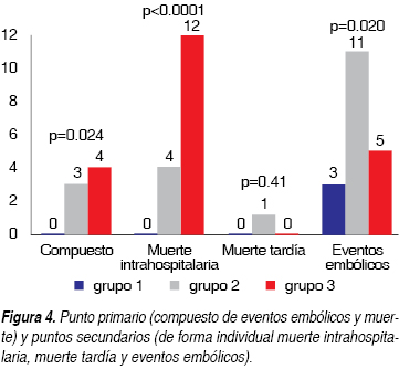 El punto primario (conjunto de muerte y eventos embólicos) fue significativamente mayor en el grupo 3 (4 pacientes [57.1%]), comparado con el grupo 1 (0%) y el grupo 2 (3 pacientes [42.9%]), p = 0.024. Con respecto a los puntos secundarios evaluados de forma individual, encontramos que la mortalidad intrahospitalaria fue significativamente mayor en el grupo 3 (12 pacientes [75%]), p < 0.0001; los eventos embólicos se presentaron con mayor frecuencia en el grupo 2 (11 pacientes [57.9%]), p = 0.020; y la mortalidad tardía solamente se presentó en un paciente del grupo 2, p = 0.41. La descripción detallada por grupos se expresa en el cuadro III y la figura 4