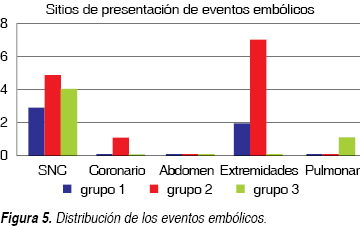 El sitio más frecuente de embolismo fue el sistema nervioso central en los tres grupos, seguido de las extremidades. Sólo un paciente presentó embolismo del tronco coronario izquierdo y un paciente embolismo pulmonar (Figura 5). Se describe en la literatura que los sitios más frecuentes de embolismos reportados son hacia el sistema nervioso central y el bazo. En nuestro estudio no se reportó ningún evento embólico hacia el bazo; sin embargo, es importante recalcar que hasta el 20% de los embolismos hacia este órgano cursan asintomáticos.7,8