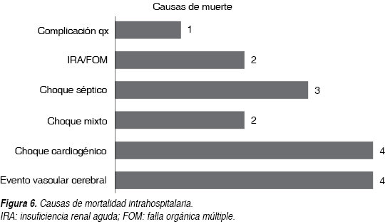 Las principales causas de muerte intrahospitalaria en nuestro estudio fueron choque cardiogénico y evento vascular cerebral, similar a lo reportado en la literatura (Figura 6);1 por lo tanto, valorar los factores que pudieran predecir qué pacientes se encuentran en mayor riesgo de presentar estas complicaciones nos puede ayudar a establecer una estrategia más agresiva y oportuna en estos pacientes, ya sea con antibióticos de amplio espectro y una cirugía emergente o urgente.