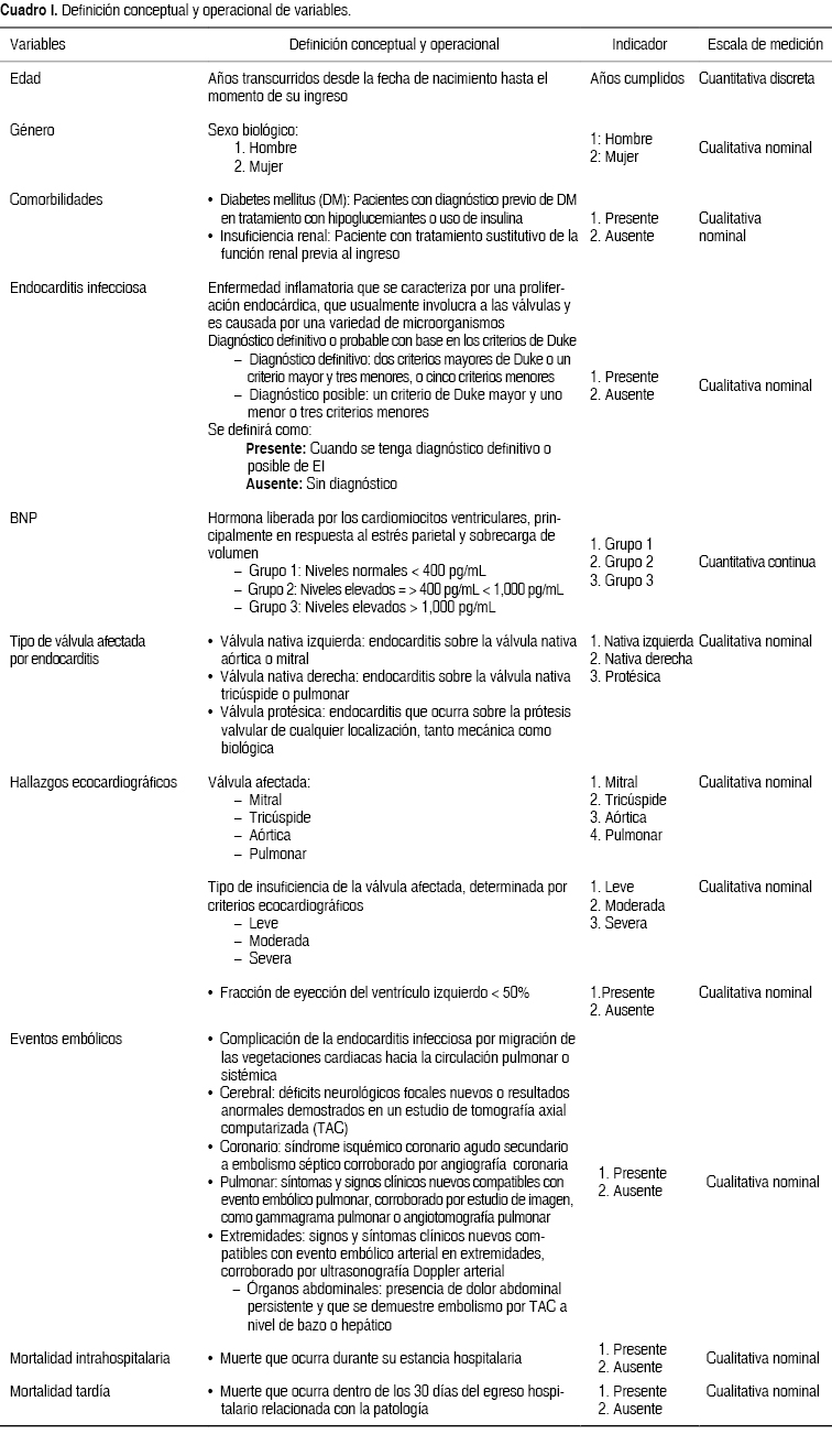 En este estudio se revisó el registro de ingresos por endocarditis infecciosa en el Servicio de Admisión Continua de nuestro hospital. Se dividieron en tres grupos con base en los niveles de péptido natriurético tipo B: el grupo 1 fueron aquellos con niveles normales < 400 pg/mL; grupo 2 fueron aquellos con niveles ≥ 400 < 1,000 pg/mL, y el grupo 3 con aquellos con niveles ≥ 1,000 pg/mL. Posteriormente se llenó la hoja de recolección de datos inicial y se realizó el seguimiento del paciente durante su hospitalización mediante la revisión del expediente clínico. En los casos prospectivos se llevaron a cabo visitas médicas periódicas, con el fin de establecer la mortalidad intrahospitalaria y los eventos embólicos. Posterior al egreso hospitalario, se llevó a cabo el seguimiento mediante la consulta externa, y en caso de que los pacientes no acudieran, se realizó una llamada telefónica a los 30 días de su egreso a fin de conocer la mortalidad tardía, con lo que se completó la recolección de datos. Como punto primario del estudio se analizaron el compuesto de muerte y los eventos embólicos, y como punto secundario, de forma individual, se analizó la muerte intrahospitalaria, eventos embólicos y mortalidad tardía (Cuadro I).