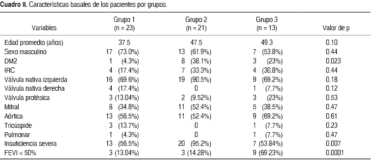 En cuanto a la lesión condicionada por la endocarditis infecciosa, se encontró que hasta el 70% de los pacientes presentaban insuficiencia valvular de grado severo, siendo esto más común en el grupo 2 (95.2%) con una diferencia estadísticamente significativa que el resto de los grupos (p = 0.007). Asimismo, la fracción de eyección del ventrículo izquierdo < 50% se observó con mayor frecuencia en el grupo 3 (69.23%) comparado con los grupos 2 y 1, en los que se presentó con 14.28 y 13.04%, respectivamente (p = 0.0001).