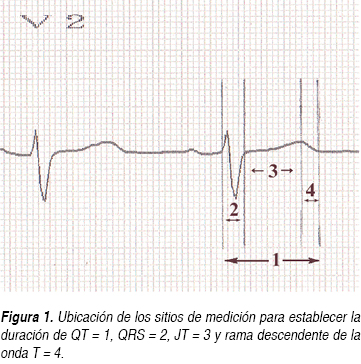 Con ayuda de una regla calibrada y una lente de aumento, uno de nosotros (ER) midió los segmentos R-R, QT, QRS, y la rama descendente de la onda T (rdT), desde la cima hasta la unión con la línea isoeléctrica para así, integrar lo que llamamos el índice rdT/JT (Figura 1) en la derivación, en la cual las deflexiones fueran más claras.