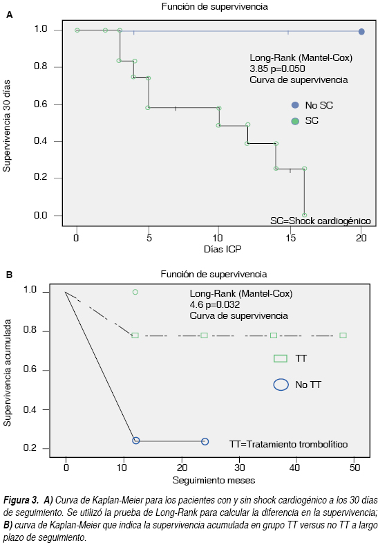 Seguimiento a largo plazo: a un seguimiento de 13.25 + 12.6 meses (r = 2 a 42 meses) ocho pacientes (47 %) estaban libres de eventos cardiovasculares mayores (ECVM) (muerte, IAM, reintervención) en una clase NYHA I, con un incremento significativo en la FEVI previa 36.7 + 8.8 actual de 48.1 + 6.03 p < 0.001, no documentándose shunt en ninguno de los pacientes. La curva de supervivencia de Kaplan-Meier en pacientes en ShC versus no ShC a 30 días, así como la sobrevida a largo plazo en pacientes sometidos a TT versus no TT son descritos en la figura 3