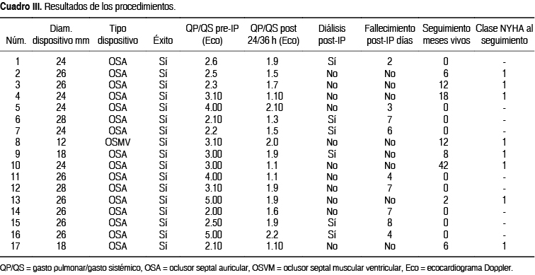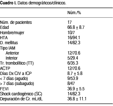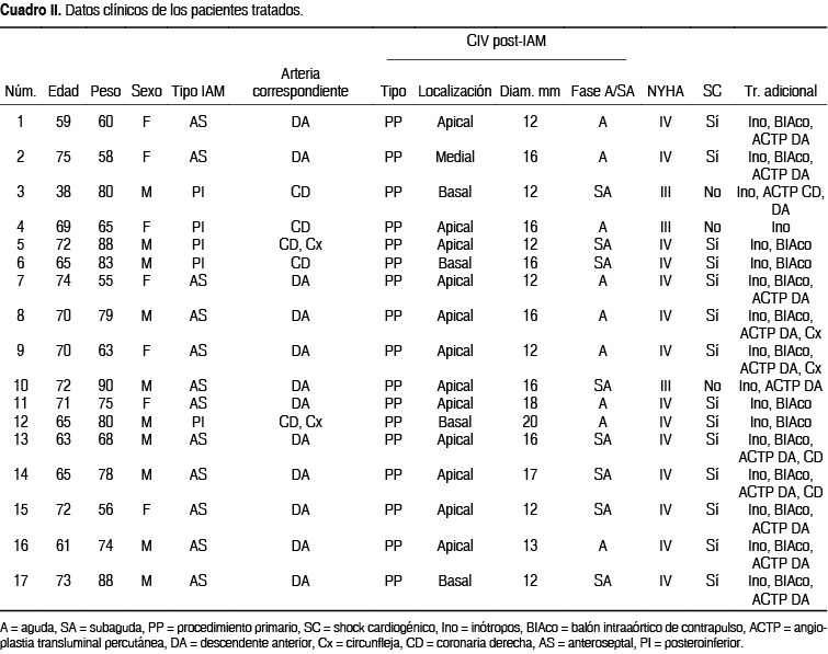 Material y métodos: se llevó a cabo un estudio observacional, retrospectivo, analítico y comparativo, obteniéndose la información de la base de datos del Departamento de Hemodinámica, UMAE núm. 34, IMSS, del periodo comprendido de junio del 2006 a enero de 2014, y se incluyeron a un total de 17 pacientes con diagnóstico de CIV post-IAM. Se utilizaron las técnicas descritas previamente.23-25 El cierre percutáneo fue considerado en pacientes con significativo cortocircuito de izquierda a derecha (QP/QS ≥ 1.5), anatomía del defecto y la ubicación accesibles para el cierre con el dispositivo. El tamaño y la localización de cada defecto, así como los criterios de exclusión, se evaluaron por ecocardiografía transtorácica o transesofágica y consistía en una CIV grande (≥ 35 mm), un CIV apical sin adecuado reborde muscular y un variador de velocidad basal que se encontrara demasiado cerca de las válvulas mitral, tricúspide y/o aparato valvular aórtica. Durante el periodo de nuestro estudio ninguno de nuestros pacientes fue excluido, debido a los criterios definidos anteriormente. Los datos clínicos de los pacientes se exponen en el cuadro I