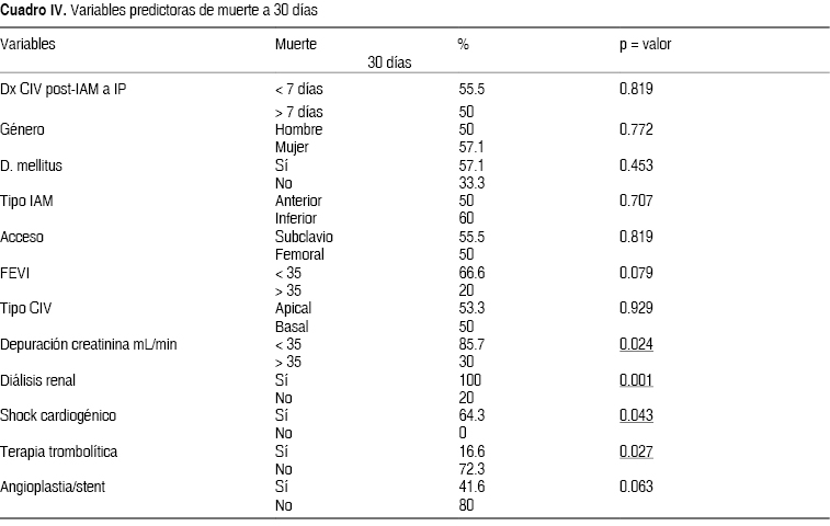 Los resultados de cierre percutáneo con dispositivo son difíciles de comparar con los de las series publicadas quirúrgica, dado el pequeño número de pacientes y el sesgo de selección inherente presentes en casi todos estos estudios. Los predictores de mayor mortalidad quirúrgica incluyen inestabilidad hemodinámica, disfunción ventricular, CIV inferior o basal y abordaje agudo (< 15 días).31-34 En contraste con la cirugía, los defectos inferobasales son más fáciles de cerrar con una técnica intervencionista, debido al acceso más favorable de la vena subclavia o yugular derechas. Las tasas de mortalidad actuales en el cierre quirúrgico CIV post-IAM se mantienen altas en 20 a 87%, dependiendo de la gravedad del paciente, la duración del seguimiento en algunos estudios y el tiempo de la corrección quirúrgica < o > de 4-6 semanas, después de la ocurrencia de la CIV para permitir la cicatrización del reborde circundante.35,36 Tal práctica sin duda dará lugar a resultados sesgados sobreviviendo los más aptos y menos enfermos.37 En nuestro estudio no excluimos a ningún paciente, a pesar de que el 84.2% de los pacientes estaban en estado de ShC, incidencia mayor de la reportada en las series quirúrgicas. En el cuadro IV analizamos las variables predictoras de mortalidad a 30 días.