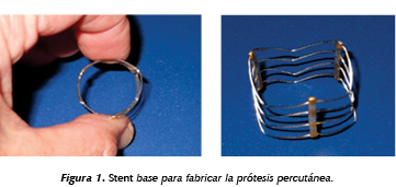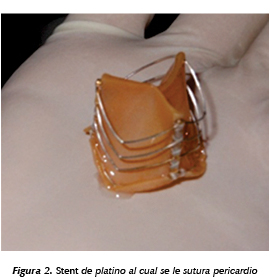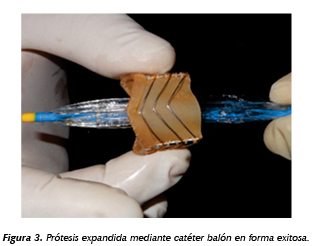 Introducción: Las prótesis percutáneas, son en la actualidad una realidad para el tratamiento de algún subgrupo de pacientes, su costo es elevado y se requiere desarrollar tecnología propia en el país. Material y métodos: Se fabrica mediante alambre de platino iridio. Consta de 3 postes y de 12 alambres de forma angulada, estos elementos son soldados entre ellos mediante oro puro (Figura 1). Se sutura una banda de pericardio bovino preparado de 400 micras de espesor con prolene 6 ceros (Figura 2). Realizamos pruebas al montarlo sobre un balón de diámetro de 25 mm mediante un climping device y se realizaron pruebas de su comportamiento físico y de la estructura de la válvula de pericardio a la expansión. Se analizó el comportamiento de la prótesis expandida en un probador de válvulas que simula el flujo transaórtico normal. Resultados: Se fabricaron de cuatro prótesis: dos probadas en el catéter balón, su compresión y expansión libre. En ambas se logró la expansión al diámetro total con distancias de los postes en forma equidistante y sin desalineación o inclinación de los mismos, las membranas pericárdica intactas y móviles, coaptando al 100% (Figura 3). Una prótesis se probó en una manguera plástica de 23 mm de diámetro, fue liberada exitosamente logrando la coaptación de la circunferencia de la prótesis en forma adecuada, y la prueba del desplazamiento de las membranas pericárdicas en ambos sentidos mediante un chorro de aire, de apertura y cierre, fueron adecuadas. Una se montó en el simulador de flujo cardiaco, mostrando un comportamiento fisiológico adecuado con sellado completo en diástole y área de apertura adecuada (Figura 4). Conclusiones: Estos resultados de la fabricación y pruebas físicas de la prótesis aórtica expansiva con balón resultaron muy satisfactorios y dan pie a iniciar experiencia en fase animal.