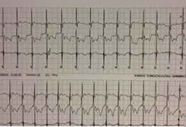 Introducción: La Ibervillea sonorae es una raíz mexicana usada por sus propiedades hipoglucemiantes para la diabetes mellitus. Un efecto adverso, al ser un secretagogo de insulina, es la liberación de potasio hacia el espacio extracelular por inhibición de canales sodio-potasio, que condiciona hiperkalemia y riesgo de arritmias. Material y métodos: Paciente masculino de 61 años de edad con diabetes mellitus de tipo 2 en tratamiento con metformina 850 mg diarios y desde hace dos meses toma Conglufit (wereque, nopal, xoconostle) comprimidos de 850 mg cada ocho horas. Tabaquismo crónico con índice tabáquico de 68.3 paquetes/año y alcoholismo crónico llegando semanalmente a la embriaguez. Inicia ocho días previos a su internamiento con ataque al estado general. Posteriormente disnea en reposo y síncope, es llevado a urgencias en donde ingresa consciente y se documenta taquicardia ventricular monomórfica sostenida con una frecuencia ventricular media de 150 latidos por minuto. Se da manejo farmacológico con amiodarona logrando revertir y obteniendo un trazo de bradicardia sinusal con bloqueo auriculoventricular de primer grado. Resultados: Se solicitaron paraclínicos a su ingreso donde se evidencia hiperkalemia de 7.7 mEq/L y se inicia manejo médico. Fue valorado por toxicología, la cual considera exacerbación de la misma por el consumo de wereque; reportando elevación de transaminasas con resto de PFH normales. Depuración de creatinina normal. Se corrigió el potasio pero persiste con bradicardia sinusal, se realiza ecocardiograma encontrándose normal y la coronariografía reporta coronarias sin lesiones, con flujo TIMI 3 en todos los vasos. Conclusiones: La taquicardia ventricular que presentó el paciente fue secundaria a hiperkalemia ocasionada por el consumo de Conglufit, ya que se descartó enfermedad renal y cardiopatía isquémica. Los tratamientos naturistas alternativos para la diabetes, de uso común en nuestro medio, no son una opción inocua; y el uso de wereque puede condicionar hiperkalemia, con el potencial riesgo de arritmias.