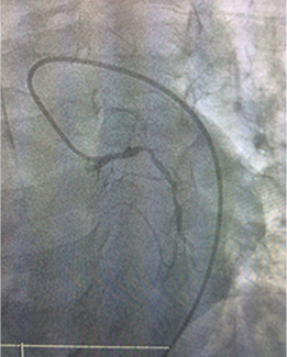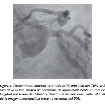 Introducción: La presencia de aneurismas ventriculares verdaderos se observa en el 5% de los pacientes tras un infarto, su incidencia ha disminuido en los últimos 5 a 10 años de acuerdo con la mayor disponibilidad de la terapia de reperfusión. Más del 80% de los aneurismas, se encuentran anterolateralmente cerca del ápex, asociándose con la oclusión de la descendente anterior y un suministro sanguíneo colateral pobre, como el caso clínico que presentamos a continuación. Presentación de caso: Varón de 61 años. Antecedentes: Tabaquismo, alcoholismo, DM2 y dislipidemia. Dos años antes tuvo infarto anteroseptal sin terapia de repercusión o revascularización. Posterior al infarto tratamiento para insuficiencia cardiaca e isquémico óptimo. Acude a control para estratificación por angina crónica estable en clase funcional II, con prueba de esfuerzo, la cual se reporta positiva temprana para cardiopatía isquémica, ecocardiograma acinesia en segmentos apicales, septal y lateral, fracción de expulsión del 30%, insuficiencia mitral moderada. Coronariografía: Descendente anterior estenosis proximal del 70%, segmento medio estenosis del 80%, distalmente el vaso es fino difusamente enfermo. Resto de segmentos arteriales coronarios epicárdicos sin estenosis angiográficas significativas. La ventriculografía con aneurisma gigante anterolateral (Figura 1), fracción de expulsión del 14%. En sesión médico quirúrgica se concluye que se trata de zona infartada con aneurisma gigante y fracción de eyección deteriorada, siendo desestimado para cirugía, siendo su mejor opción el tratamiento médico óptimo. Conclusión: La sobrevida de los pacientes que sufren un infarto y desarrollan un aneurisma ventricular disminuye dramáticamente frente a quienes no lo desarrollan. En este caso llama la atención el tamaño del aneurisma y que a dos años de haber sufrido el síndrome coronario se mantuviera relativamente estable sin presentar eventos cardiovasculares mayores. Este es un buen ejemplo de que el tratamiento óptimo se asocia con buenos resultados clínicos a largo plazo.