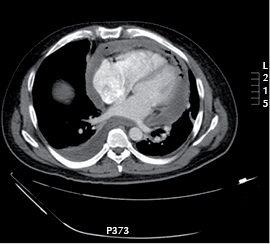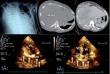 Paciente masculino de 36 años de edad, el cual inicia un mes previo a ingreso hospitalario con disnea de pequeños esfuerzos, dolor a la inspiración, con una radiografía con imagen de masa pulmonar, llega a hospital en mal estado general, con diaforesis, adinamia, astenia, con insuficiencia respiratoria que requiere de intubación orotraqueal y apoyo mecánico ventilatorio. En la tomografía se encuentra: Imagen hiperdensa, heterogénea, alternada con áreas hipodensas difusas que sugieren áreas de necrosis, involucrando al diafragma, con severo desplazamiento caudal y ventral del hígado, con evidente desplazamiento mediastinal hacia la izquierda. Llevado a cirugía donde se encuentra masa total del lado derecho, friable, con histopatológico de schwannoma maligno. Se solicitó ecocardiograma encontrando corazón desplazado a la izquierda, involucra el techo de ambas aurículas con deformación de las mismas por el desplazamiento y con deterioro en el llenado auricular. Comentario: El schwannoma, también conocido como neurilemoma, es un tumor originado en las células de Schwann de la cresta neural y que aparece predominantemente en el ángulo ponto cerebeloso, en pares craneales y en la médula espinal y que es menos frecuente en el retroperitoneo, en mediastino posterior y en la pelvis. Se considera una rareza en la pared torácica y en otras localizaciones. Puede ser de naturaleza benigna o maligna, pero predominan los primeros, que suelen ser encapsulados, bien delimitados, perineurales, unidos o no al nervio que le da origen y se presentan como masas duras, de color grisáceo y con áreas de degeneración quística y aspecto blanco amarillento xantomatoso. El schwannoma maligno es muy agresivo, localmente invasor, suele recidivar y metastizar y por tanto es de muy mal pronóstico.