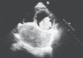 Paciente masculino de 71 años de edad el cual tiene antecedente de enfermedad arterial coronaria conocida por cirugía de revascularización desde el 2001, portador de EPOC, con fibrilación auricular crónica, ha estado en vigilancia en la unidad desde su cirugía con ecocardiogramas seriados cada año, sin síntomas de cardiopatía isquémica desde hace años. Se ha observado desde hace cinco años la presencia de una masa de ecodensidad homogénea, regular, paredes lisas a nivel de pericardio vista en el eje paraesternal largo a nivel del anillo de la válvula mitral, fija, no móvil, sin datos de infiltración, dimensión 32 x 31 mm, el cual no ha variado en las visitas subsecuentes. De momento sólo se ha tenido en vigilancia, ya que no tiene cardiopatía isquémica activa, la masa no tiene datos de ser maligna y no ha variado su forma o tamaño en el trascurso de los años. Comentario: Los quistes pericárdicos son los más frecuentes de los tumores benignos pericárdicos. Representan un receso ciego persistente del pericardio parietal tiene una incidencia de la segunda-tercera década de la vida con incidencia similar en ambos sexos. Se detectan a raíz de una radiografía de tórax: hallazgo incidental, localizados en unión cardiofrénica derecha (70%) y en el 22% en la izquierda. Diagnóstico diferencial: tumores sólidos. Aneurismas de VI. Orejuela izquierda prominente. Hernias diafragmáticas o hiatales. En este caso en particular a través de los estudios se ha descartado la hernia hiatal, tumores y el aneurisma del ventrículo izquierdo.