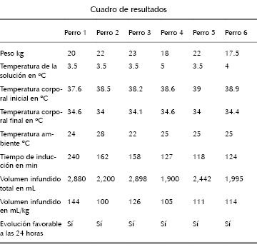 Actualmente la hipotermia terapéutica (HT) es recomendada como tratamiento adjunto en los pacientes comatosos secundaria a una parada cardiaca extrahospitalaria como medida de protección cerebral. El control estricto de la temperatura durante la HT es importante ya que temperaturas menores a los 33° C pueden producir efectos deletéreos para el paciente. Metodología: Se realizó un estudio experimental con modelos caninos, se utilizaron seis perros anestesiados. La evolución fue favorable cuando el perro presentara deambulación, alimentación, defecación y estado de ánimo adecuado. Se realizó punción hacia cavidad peritoneal con previa asepsia y antisepsia. Posteriormente se administró un bolo de solución fisiológica a 4 oC + 1 oC de 30 mL/kg por vía peritoneal, y se inició infusión de 48-42 mL/kg/h por vía peritoneal. Se hizo monitoreo mediante electrocardiografía y temperatura esofágica continua. La infusión fue suspendida una vez alcanzada una temperatura esofágica <34.5 oC. El veterinario evaluó a todos los modelos caninos a las 24, 48 y 72 horas posterior a la realización de la hipotermia. Resultados: Todos los perros alcanzaron la temperatura objetivo (34 oC), la mediana del peso de los perros fue de 22 kg, la mediana de la temperatura del suero fisiológico de 4 oC, la mediana de la temperatura corporal de los perros fue de 38.6 oC, con una mediana de temperatura al final de las infusiones de 34.6 °C, la mediana de tiempo para alcanzar la temperatura objetivo fue de 127 min con una mediana de líquido infundido de 111 mL/kg de peso. Conclusiones: En nuestro trabajo piloto se observó que la hipotermia terapéutica por vía peritoneal fue rápida, efectiva y segura en los perros. Sin embargo, hacen falta más estudios para implementación en humanos.