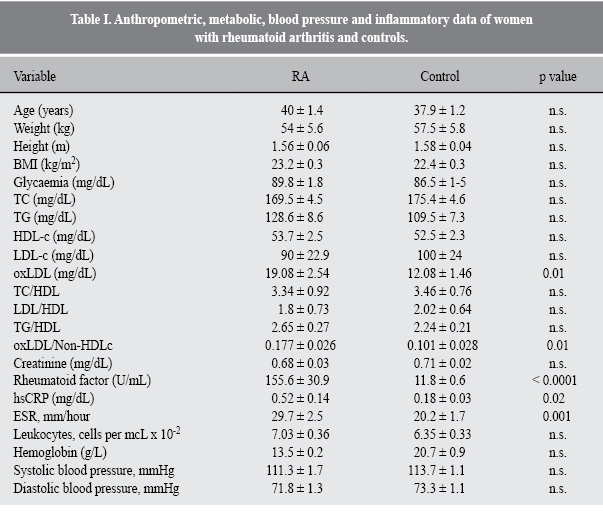 A convenience sample of 30 patients with rheumatoid arthritis (RA) and 31 individuals serving as matching controls were recruited, all of them women, aged 25-50 years, from the outpatient clinic of Hospital 1o de Octubre, Mexico. RA was diagnosed with the criteria of the American College of Rheumatology (ACR)/European League Against Rheumatism (EULAR).13 Patients were excluded if they had three or more ATP III traits of the metabolic syndrome, diabetes mellitus, hypertension, smoking or alcohol drinking habits (or other drug addictions), clinically evident ischemic heart disease, antecedent of stroke or peripheral artery disease, obesity (body mass index ≥ 30), rheumatoid cachexia, pregnancy, any acute inflammatory ailment or chronic serious disease, and were under therapeutic regimes with statins, fibrates, ACE inhibitors or AT1 angiotensin receptor antagonists, or antioxidants. Control individuals were non-rheumatic healthy women, of the same age group, without any of the abovementioned exclusion criteria. Protocol was approved by both Ethics and Research Institutional Committees and the survey was conducted according with the Declaration of Helsinki, Good Clinical Practices and Mexican Federal Regulations. In all patients the body mass index (BMI) was calculated dividing the weight by the squared height (kg/m2). Blood pressure was measured with a mercurial sphygmomanometer, under the standardized technique. A blood sample was obtained by venous puncture and fasting serum glucose, creatinine, total cholesterol (TC); high-density lipoprotein (HDL-c) and triglycerides (TG), were determined by means of colorimetric assay kits, according with the manufacturer's instructions. Low-density lipoprotein cholesterol (LDL-c) was calculated using the Friedewald equation. Non-HDL-c was estimated subtracting HDL-c to TC. It is known that non HDL-c represents all cholesterol fractions with apo B100 thus, signaling the atherogenic mass of total cholesterol. The oxidized fraction of LDL was assessed through a commercial ELISA kit, following manufacturer's instructions. Inflammatory markers were also obtained: high-sensitivity C reactive protein (hsCRP) and erythrocyte sedimentation rate (ESR).