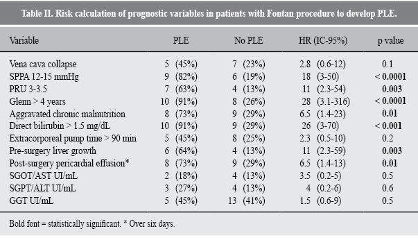 On the bivariate analysis to calculate the HR to develop PLE, the statistically significant variables were (Table II): SPPA between 10-12 mmHg; PRU between 3-3.5 Wood units; time between the Glenn and Fontan procedures; aggravated chronic malnutrition; hepatomegaly before surgery, and the development of pleural effusion on the immediate post-surgery period.