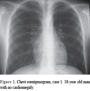 Physical examination was irrelevant in every case, but there was a systolic murmur in three cases (60%). X-ray chest film showed cardiomegaly grade II and venocapillary hypertension in two patients (Figure 1), being normal on the remaining three patients (Figure 2). In two cases (40%) resting EKG showed subendocardial ischemia, in one case signs of anteroseptal necrosis was found (Figure 3), while in the remaining two cases any electrocardiographic abnormality was detected (Figure 4).