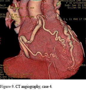 Myocardial scintigraphy was performed on four patients, finding moderate to severe anterolateral ischemia (Figure 8). CT angiography was performed on four patients, finding absence of left coronary artery, the origin of the left coronary artery from the pulmonary artery and contralateral coronary circulation (Figure 9)