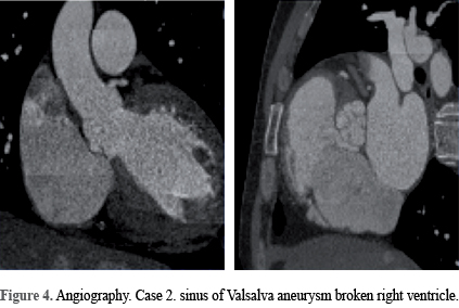 A 32 years-old woman without cardiovascular risk factors and no previous cardiovascular disease, began to have progressive dyspnea, palpitations and lower limbs edema, after chest trauma. A continuous murmur was auscultated in the precordial area. X-ray chest film showed cardiomegaly and cephalization of blood flow, whereas ECG had signs of left ventricular hypertrophy. Echocardiogram showed ruptured right VSA of 10 mm into the right ventricle, with color mosaic and turbulence at this level. Angiotomography confirmed the lesion (Figure 4). Percutaneous closure with Amplatzer septal occluder, guided by three-dimensional transesophageal echocardiography, was carried out, uneventfully. In the follow-up, the patient is in good clinical conditions.