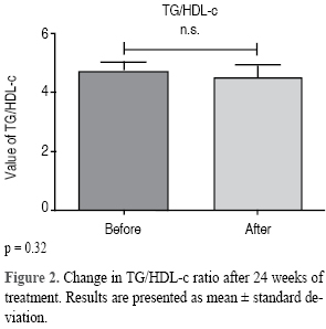 The TC/HDL-c ratio showed an average decrease of 0.58 with an initial average of 5.02 ± 1.36 and at the end of the study of 4.44 ± 0.97 (IC: 0.20 to 0.96), p = 0.003 (Figure 1). An average decrease of 8.50 mg/dL of the LDL-c fraction was observed. The average concentration of triglycerides had an increase of 7.10 mg/dL, going from 181.80 ± 74.75 mg/dL to 188.91 ± 98.16 mg/dL (IC: -32.02 to 17.73), p = 0.56. The TG/HDL-c index went from the initial value of 4.90 ± 2.62 to 4.41 ± 2.97 at the end of the study (IC: -0.45 to 1.43) p = 0.302 (Figure 2).