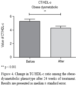 In overweighed individuals belonging to the dysmetabolic phenotype, no significant changes in biochemical patterns, lipoprotein quotients or anthropometric measurements were observed. On the contrary, obese subjects within the dysmetabolic phenotype experienced the most remarkable changes in concentrations of HDL-c (from 36.65 ± 1.50 mg/dL at the beginning of the study to 40.79 ± 1.17 mg/dL at the end of it) (IC: 20.50 to 84.50, p = 0.47). Also, the TC/HDL ratio diminished from 5.25 ± 0.33 at base data to 4.31 ± 0.25 at the end of the trial (CI: 96.0 to -9.0, p = 0.004) (Figure 4).