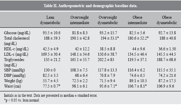 There were dissimilarities of several variables among subjects pertaining to different phenotypes. For example, waist circumference between subjects with normal weight in comparison with the other groups (Table II).