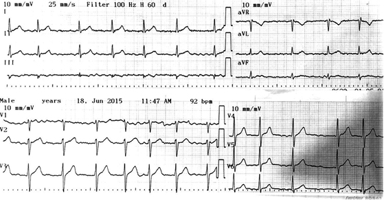 A 52-year-old man with history of arterial hypertension (CHA2DS2VASC: 1) was admitted in June 2015 for palpitations and nausea; his initial ECG in the emergency room revealing atrial fibrillation. He described previous episodes of short lasting palpitations, without previous documentation of AF (first detected AF). After initial evaluation, he refered chest pain oppression without ECG changes suggesting acute ischemia (Figure 1) but because of an elevated troponin I result (0,595 ng/mL; reference value: 0,012-0,024 ng/mL) he was diagnosed with an acute myocardial infarction without ST elevation (NSTEMI). Anticoagulant (enoxaparine 1 mg/kg each 12 hours) and anti-platelet aggregation (load of acetylsalicylic acid 300 mg and clopidogrel 300 mg both PO) were administered and the patient underwent coronary angiography. During the procedure, a fresh thrombus in the proximal portion of the anterior descendent artery (ADA) with total occlusion of distal circulation was found (Figure 2), without significant atherosclerosis. Mechanical thrombectomy with aspiration of a red thrombus was performed out, restoring blood flow through the vessel with a residual oclussion at the distal portion of the ADA. Subsequent attempts during the same procedure completely restored normal blood flow.