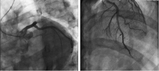 Figure 2: Coronary angiography. Left (CAU 26o, RAO19o): Oclussion of the proximal ADA proximal produced by a thrombus. Right (CAU 25o, RAO 22o): ADA reperfusion with a residual thrombus in the distal portion. CAU = Caudal, RAO = Right anterior oblique, ADA = Anterior descending artery.