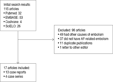 Methods: A systematic search of databases (Pubmed, EMBASE and Cochrane) was made in November 2015 using the terms ("coronary embolism" OR "coronary artery embolism" OR "coronary embolization" OR "coronary thromboembolus" OR "coronary artery embolization") AND atrial fibrillation; the search was limited to publications written in English and/or Spanish. Additionally, a search in SciELO and LILACS was performed using the English terms and their Spanish translation ("embolismo coronario" OR "embolismo de arteria coronaria" OR "tromboembolia coronaria") AND fibrilación auricular . Publications were included if coronary embolism related to AF was demonstrated by coronary angiography; publications what included patients with prosthetic valves or alternative sources of emboli (ateromatosis with suspect of ateroemboli, infective endocarditis) were excluded. Additionally, bibliographic references of the included publications were reviewed, aiming to identify studies which had not been included during the initial search. The PubMed search yielded 32 results, out of which 19 were initially excluded due to an alternative source of embolism because they were unrelated with the study question (coronary embolism associated to AF without prosthetic valves or another emboli causes); another publication was excluded because it was a letter to editor. The EMBASE search yielded 53 results in total, out of which 30 were excluded due to an alternative source of embolism; 7 were unrelated to the study question (including two posters in which there was no demonstration of coronary embolism at coronarography) and 11 were excluded because of duplicate publication (10 articles identified in the previous database search and 1 with patients included in another publication). As a result, 5 publications were included from the EMBASE search. The Cochrane search yielded four results, none of which were related with the topic. The search in SciELO yielded 26 results in total (24 in English and 2 in Spanish); all were excluded because they were unrelated with the study question. The search in LILACS and Latindex did not yield any results. As a result, 17 articles were analyzed for this review (13 case reports and 4 case series) (Figure 3).